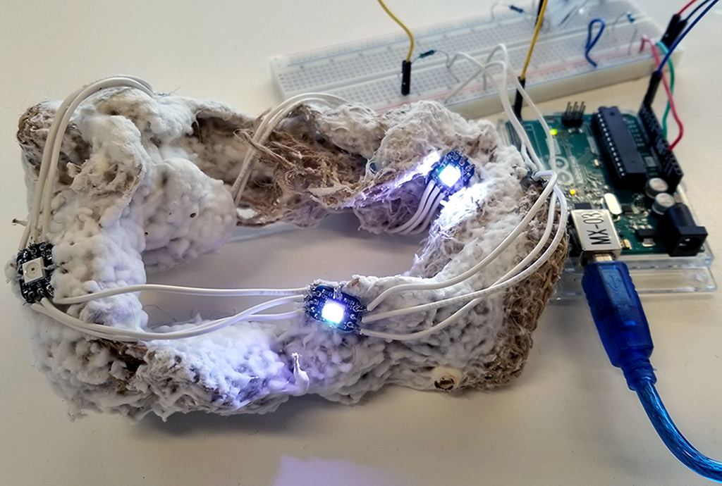 At the moment, we are testing the possibility of covering the electric wires and NeoPixel lights with waterproof plastic shrinking tubes, inserted inside the burlap, and then inoculated with mycelium. When the prototype will be ready, thirty more inoculated shapes will be created representing an enlarged version of numerous radial structures with fungus hypha connected to one another.