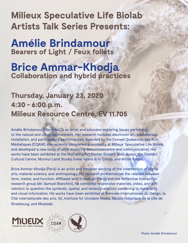 public talks, visiting researchers Artist Talk: Amélie Brindamour and Brice Ammar-Khodja Posted by speclifebiolabtech on January 21, 2020 Our first Artist Talk of the year is taking place this Thursday from 4:30-6:00pm! Share this: Click to share on X (Opens in new window) X Click to share on Facebook (Opens in new window) Facebook Like Loading... Related