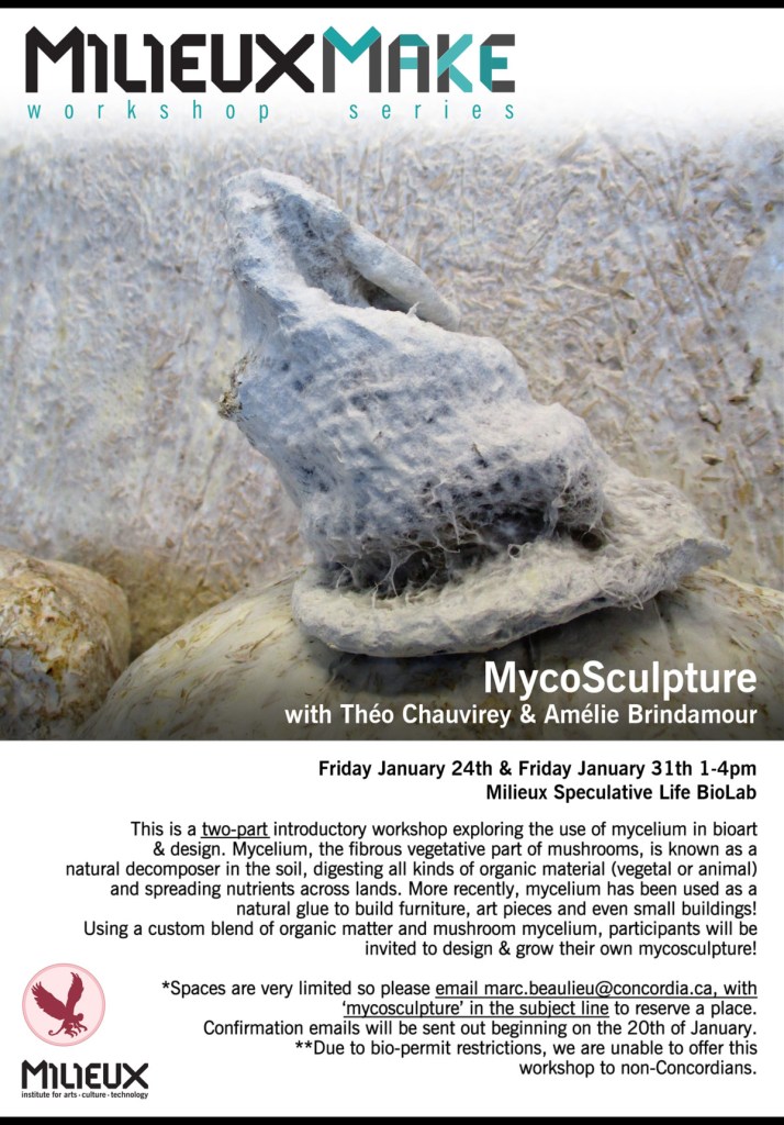 visiting researchers, workshops MilieuxMake: MycoSculpture workshop January 24th and 31st Posted by speclifebiolabtech on January 21, 2020 Théo Chauvirey and Amélie Brindamour co-facilitate a two-part introductory workshop on mycelium as a biomaterial for art and design—starting this Friday. Share this: Click to share on X (Opens in new window) X Click to share on Facebook (Opens in new window) Facebook Like Loading... Related