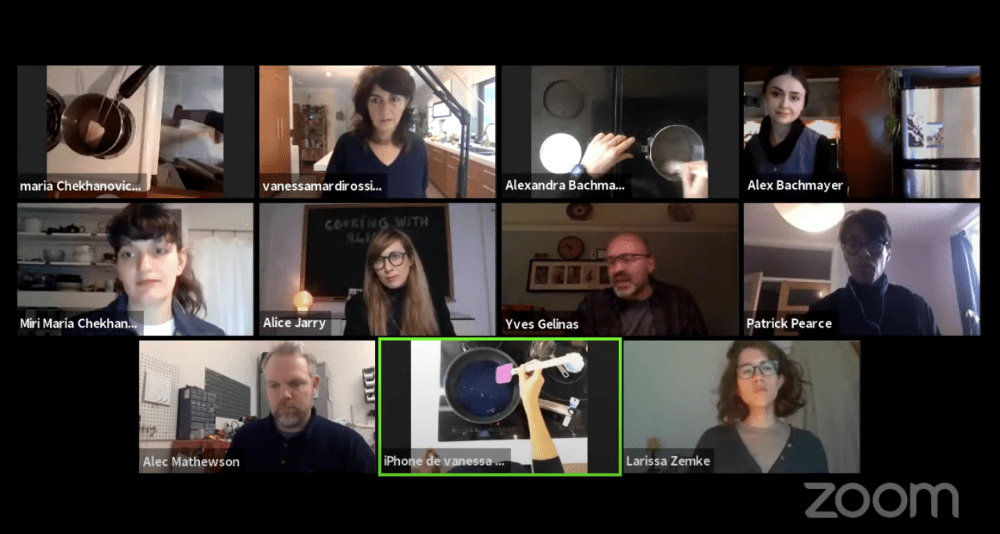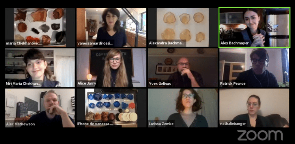 The Cyclical Matters Collective spent last Tuesday morning talking bioplastic vessels, algae-based polymers, and creative research methodologies for pandemic collaboration. In conversation with lab director Alice Jarry, chemist Yves Gélinas, and the entire Critical Materiality class, this research-creation team walked—and cooked!—us through their method for making agar bioplastic tableware.