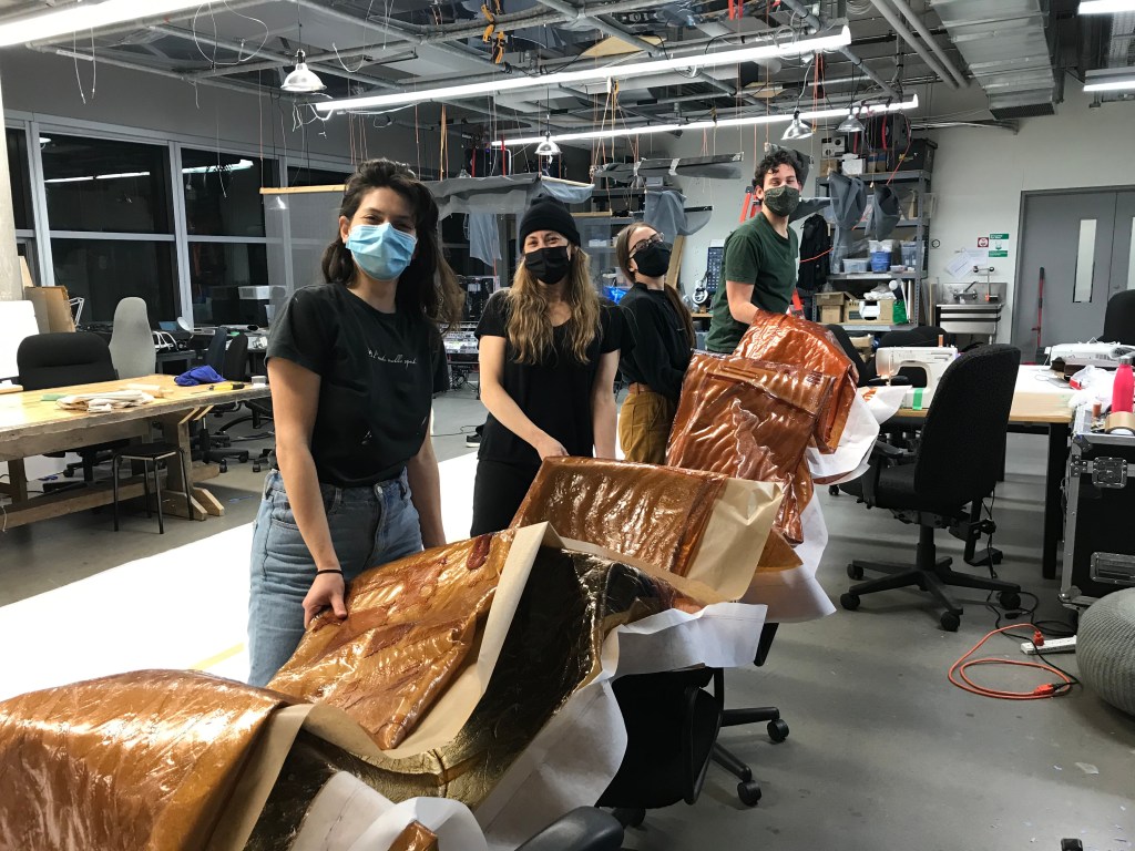 The large-scale membrane is made of a gelatine-based bioplastic — a nod to the silver gelatine photographic process — and is pigmented with natural onion skin dye. The photograms were cooked and poured into the silicone mould one at a time and then were allowed to dry completely on a rack. Finally, all of the photograms were stitched together to create the final bioplastic membrane.