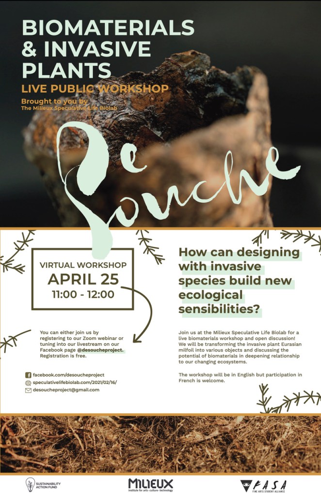 On April 25th, the BioLab will be hosting a public workshop on the intersection of biomaterials and invasive species management. This event will feature a live tutorial demonstrating how to make bio-objects derived from the invasive plant Eurasian milfoil at home with regular kitchen appliances and ingredients. It will also foster an open discussion on the potential of these methods to reshape our relationships to invasive species and our changing landscapes.
