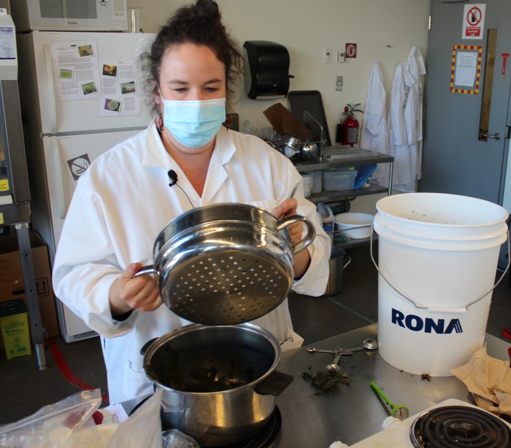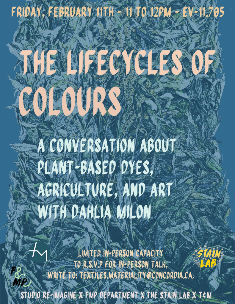On February 18th, the Textiles and Materiality Research Cluster, Studio Re-Imagine, the Department of Fibres & Material Practices, and the STAIN lab hosted textile craftsperson and dye plant cultivator Dahlia Milon for a conversation on local plant-based dyes followed by a workshop on indigo dyeing. From the BioLab and over Zoom, Dahlia was able to spend the afternoon taking us through the slow process of preparing an indigo vat, dyeing the textiles, and setting the colour.