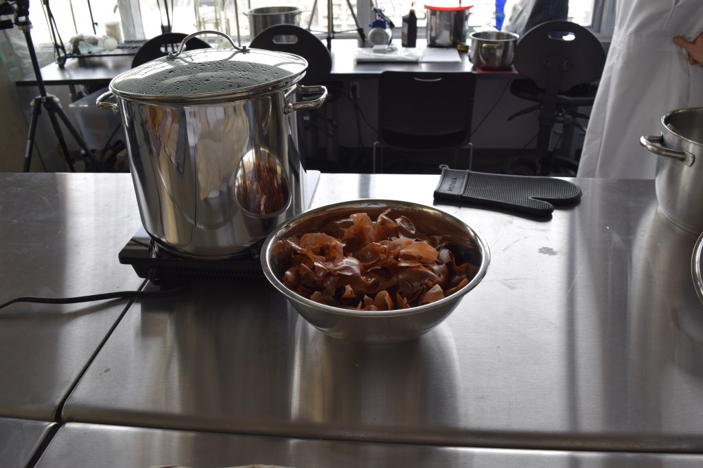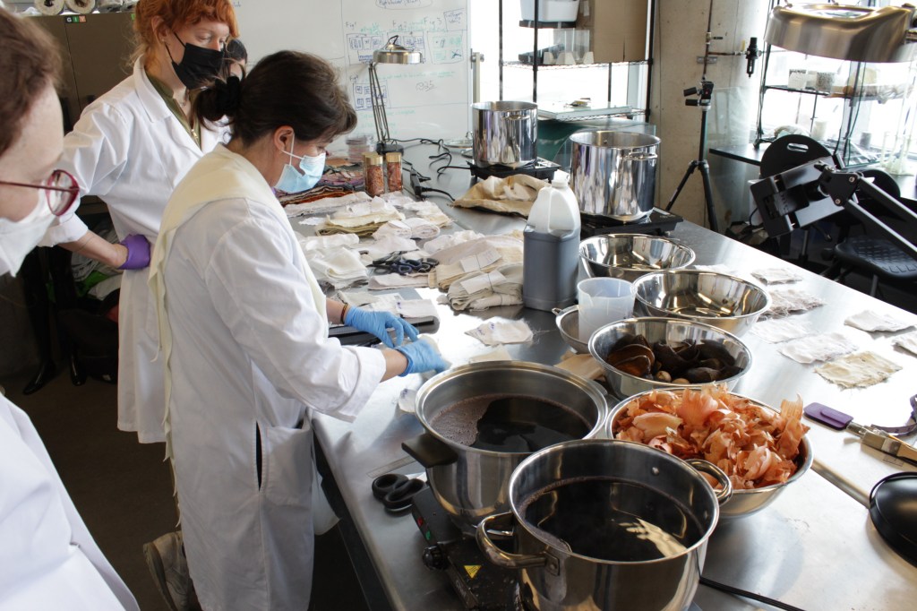 On March 15th, Vanessa Mardirossian facilitated Part I of the Cooking and Culturing Colour workshop series. She introduced participants to dyeing with food waste and showed us how to prepare protein and cellulose fibres (using different mordants and pre-treatments) for the dye baths. We prepared dyes using onion skins, avocado pits and peels, black beans, red cabbage, and turmeric. This kind of research-creation practice requires rigorous documentation and planning and Vanessa showed us some of her well-honed record-keeping methodologies.