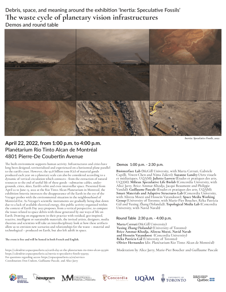 Marking the opening of the exhibition Inertia: Speculative Fossils* which intersects the disappearance of the Earth in the eye of the soon to be obsolete Voyager probes with the environmental situation in the neighbourhood of Montréal-Est, this free public activity organized as part of Hexagram’s EMERGENCE/Y programming draws parallels between the issues related to space debris and those generated by our ways of life on Earth. Drawing on engagement in their practice with residual, geo-inspired, reactive, smart or sustainable materials, the invited artists, designers, media theorists and scientists will take an interdisciplinary look at how these artifacts allow us to envision new scenarios and relationships for the waste – material and technological – produced on Earth, but also left adrift in space.