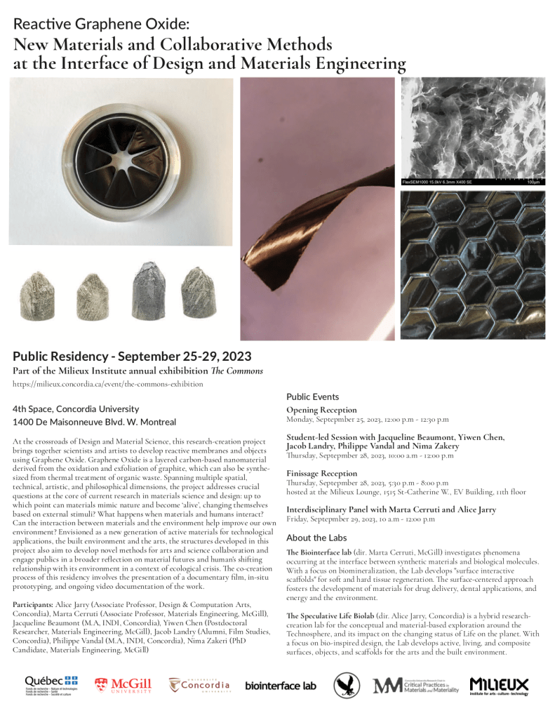 At the crossroads of Design and Material Science, this research-creation project brings together scientists and artists to develop reactive membranes and objects using Graphene Oxide. Graphene Oxide is a layered carbon-based nanomaterial derived from the oxidation and exfoliation of graphite, which can also be synthesized from thermal treatment of organic waste. Spanning multiple spatial, technical, artistic, and philosophical dimensions, the project addresses crucial questions at the core of current research in materials science and design: up to which point can materials mimic nature and become ‘alive’, changing themselves based on external stimuli? What happens when materials and humans interact? Can the interaction between materials and the environment help improve our own environment? Envisioned as a new generation of active materials for technological applications, the built environment and the arts, the structures developed in this project also aim to develop novel methods for arts and science collaboration and engage publics in a broader reflection on material futures and human’s shifting relationship with its environment in a context of ecological crisis. The co-creation process of this residency involves the presentation of a documentary, in-situ prototyping, and ongoing video documentation of the work.